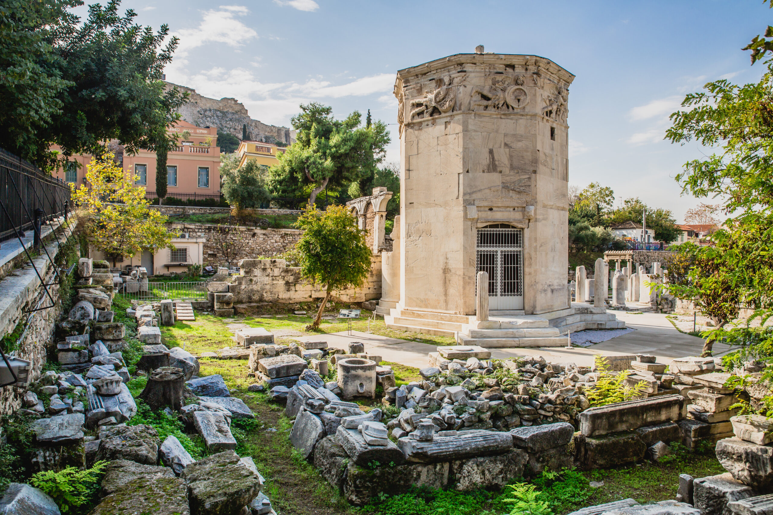 Adjacent to the Ancient Agora is the Roman Agora, built by Julius Caesar and Augustus. This site features the Tower of the Winds, an octagonal marble clocktower that served as a timepiece, weather vane, and compass. The site provides insight into the Roman influence on Athens.